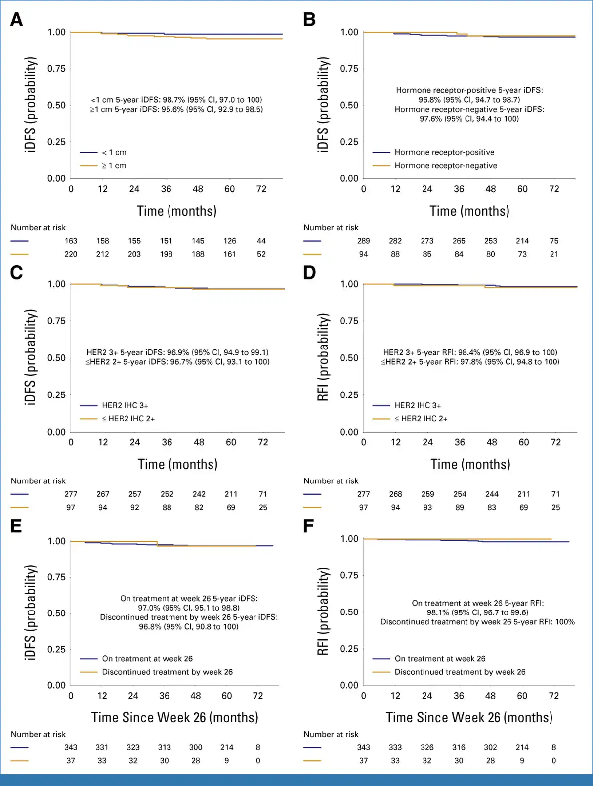 Among patients receiving T-DM1 for <6 months (n = 37, 9.7%), the 5-year iDFS was 96.8% (95% CI, 90.8 to 100) and the 5-year RFI was 100% (Fig 3E), whereas among patients receiving ≥6 months of T-DM1 (n = 343, 90.3%), the 5-year iDFS was 97.0% (95% CI, 95.1 to 98.8) and the 5-year RFI was 98.1% (95% CI, 96.7 to 99.6; Fig 3F).