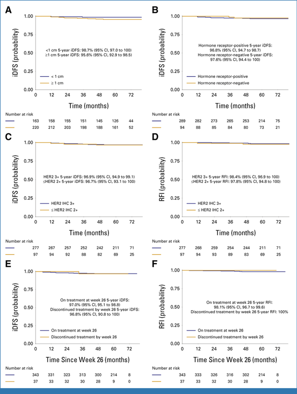 Post hoc analyses were conducted to evaluate outcomes with T-DM1 among different clinically relevant groups of patients. Comparable survival outcomes were observed with T-DM1 irrespective of the tumor size and hormone receptor status. The 5-year iDFS was 98.7% (95% CI, 97.0 to 100) for patients having tumors <1 cm and 95.6% (95% CI, 92.9 to 98.5) for tumors ≥1 cm (Fig 3A). Similarly, the 5-year iDFS was 96.8% (95% CI, 94.7 to 98.7) for patients with hormone receptor-positive tumors and 97.6% (95% CI, 94.4 to 100) for patients with hormone receptor-negative tumors (Fig 3B). Similar survival outcomes were also observed for patients receiving T-DM1 with centrally determined HER2 immunohistochemistry (IHC) 3+ disease (n = 277 [72.3%], 5-year iDFS 96.9%, 95% CI, 94.9 to 99.1) and IHC ≤2+ disease (n = 97 [25.3%], 5-year iDFS 96.7%, 95% CI, 93.1 to 100; Fig 3C), with 10 patients not having central IHC testing. Analogous results were observed for RFI (Fig 3D).