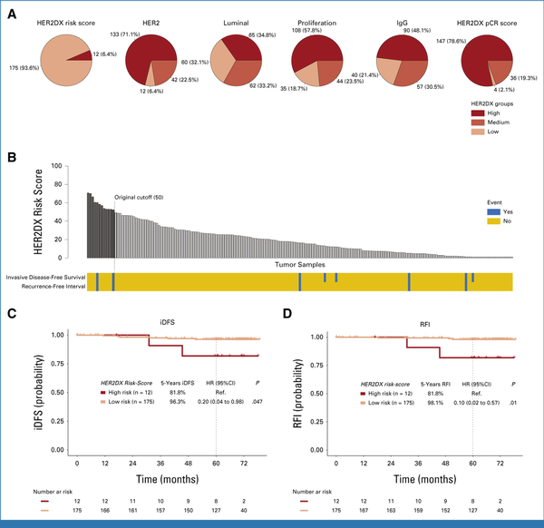 The HER2DX risk score predicts the risk of recurrence in ATEMPT. (A) Distribution of the HER2DX risk score, pCR score, and main biologic features captured by HER2DX, including the expression of HER2 mRNA, the luminal signature, the proliferation signature, and the IgG signature. (B) HER2DX risk score ranking and association with iDFS events and RFI events. Five-year (C) iDFS and (D) 5-year RFI, stratified by HER2DX risk group. Compared with patients having HER2DX high-risk disease (n = 12, 6.4%), those with HER2DX low-risk disease (n = 175, 93.6%) had significantly better 5-year RFI (98.1% v 81.8%, HR, 0.10 [95% CI, 0.02 to 0.57], P = .01) and 5-year iDFS (96.3% v 81.8%, HR, 0.20 [95% CI, 0.04 to 0.98], P = .047). HER2, human epidermal growth factor receptor 2; HR, hazard ratio; iDFS, invasive disease-free survival; IgG, immunoglobulin G; pCR, pathologic complete response; ref., reference; RFI, recurrence-free interval.