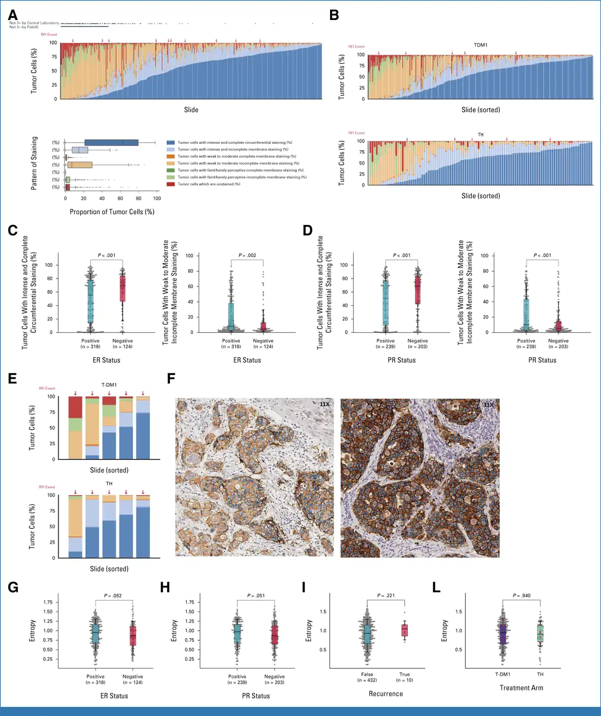 Machine learning–assisted analysis of HER2 expression patterns. (A and B) Machine learning–derived HER2 stain intensity variability in the (A) overall population and (B) by study arm. (C and D) Percentage of tumor cells exhibiting intense and complete HER2 staining or weak and incomplete HER2 staining depending on (C) ER expression and (D) PR expression. (E) Distribution of tumor cells with different HER2 staining intensities among patients experiencing RFI events in each study arm. (F) Examples of tumors exhibiting high entropy (left panel, entropy = 1.55, ie, high HER2 heterogeneity) and low entropy (right panel, entropy = 0.39, ie, low HER2 heterogeneity). The colors of the dots in each cell represent different staining intensities and completeness, as defined in Figure 2A. Entropy distribution (ie, level of HER2 heterogeneity) according to (G) the ER expression and (H) PR expression of the tumor, (I) according to the recurrence status overall, and (J) depending on the study arm. ER, estrogen receptor; HER2, human epidermal growth factor receptor 2; PR, progesterone receptor; RFI, recurrence-free interval; T-DM1, trastuzumab emtansine; TH, paclitaxel plus trastuzumab.