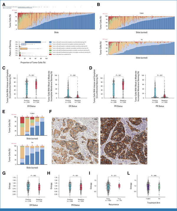 A wide range of variabilities in HER2 staining intensity was observed at a cancer cell level within and across the tumors (Fig 5A), with notable variability in both study arms (Fig 5B). Hormone receptor-positive tumors were found to be associated with a higher proportion of tumor cells expressing weak-to-moderate and incomplete membrane staining (ER: P = .002; PR: P < .001), whereas hormone receptor-negative tumors were associated with a higher proportion of tumor cells with intense and complete circumferential staining for HER2 (ER: P < .001; PR: P < .001, Figs 5C and 5D, Data Supplement, Tables S6 and S7). However, none of the HER2 stain intensity proportion features were significantly associated with the risk of recurrence among patients enrolled in ATEMPT (Fig 5E, Data Supplement, Table S8) although this analysis had limited power. The entropy of HER2 stain intensity distributions across each slide were evaluated as a measure of HER2 heterogeneity. Examples of tumors exhibiting high entropy (entropy = 1.55, ie, high HER2 heterogeneity) and low entropy (entropy = 0.39, ie, low HER2 heterogeneity) are shown in Figure 5F. Numerically higher entropy in HER2 staining distribution was observed among ER-positive versus ER-negative cases and PR-positive versus PR-negative cases although neither effect was significant (ER: U = 21,972, P = .062; PR: U = 26,866, P = .051; Figs 5G and 5H). No significant difference in entropy distribution was seen between patients experiencing or not experiencing recurrence, either in the overall study cohort (U = 2,649, P = .221; Fig 5I) or when evaluating each arm separately (T-DM1 arm: U = 1,209, P = .086; TH arm: U = 247, P = .982; Fig 5L).
