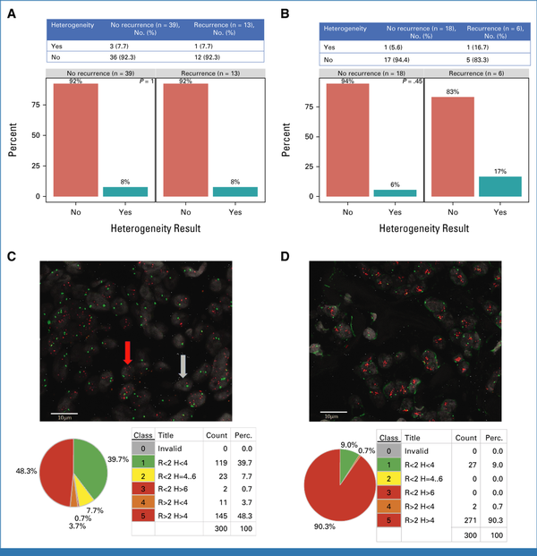 Characterization of HER2 genetic heterogeneity through single-cell FISH. (A and B) Rates of recurrence by the presence or absence of HER2 genetic heterogeneity in (A) the overall case-control study population and (B) only among patients receiving adjuvant T-DM1. (C) Example of HER2 heterogenous cases with dissection in populations of cells (in terms of absolute numbers and percentage) having different HER2 ratios and copy numbers. (D) Example of HER2 nonheterogenous case with dissection in populations of cells (in terms of absolute numbers and percentage) having different HER2 ratios and copy numbers. H, copy number; FISH, fluorescence in situ hybridization; HER2, human epidermal growth factor receptor 2; Perc., percentage; R, ratio; T-DM1, trastuzumab emtansine.