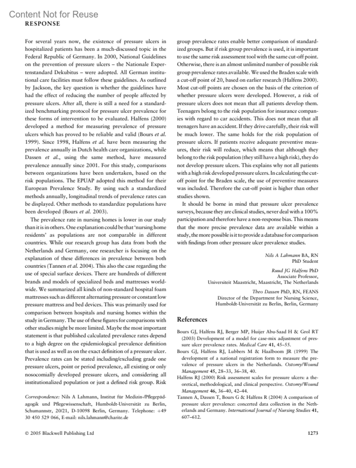 Commentary on Lahmann N, Halfens R and Dassen T (2005) Prevalence of pressure ulcers in Germany. Journal of Clinical Nursing 14, 165–172