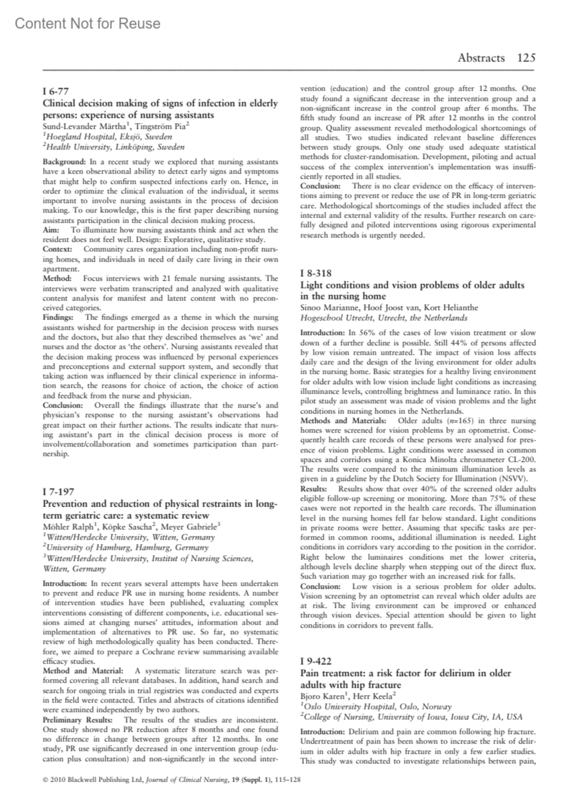 Pain treatment: a risk factor for delirium in older adults with hip fractureI 9-422Bjoro, KarenHerr, KeelaAuthor information1Oslo University Hospital, Oslo, Norway2College of Nursing, University of Iowa, Iowa City, IA, USAJournal of Clinical Nursing 19:p 125-126, October 2010.Copyright © 2010 Blackwell Publishing Ltd.