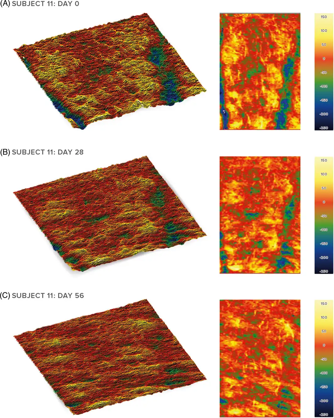 The present study assessed changes in rhytides by collecting data points that characterize surface smoothness using a three‐dimensional measurement device. The PRIMOS® Lite allows contactless in vivo capture and measures the macro‐ and microstructure evaluation of skin with high resolution, reproducibility, and objectivity. The system uses interference fringe projection to determine parameters of cutaneous relief on an identified zone of measurement. Parameters include Ra (average roughness), Rz (average relief), and Rt (maximum height of the relief or maximum relief amplitude). A decrease in Ra signifies smoother skin, while decreases in Rz and Rt represent a reduction in rhytides. Results of this study demonstrated significant improvements in rhytides and skin roughness in 71% of subjects after 28 days.