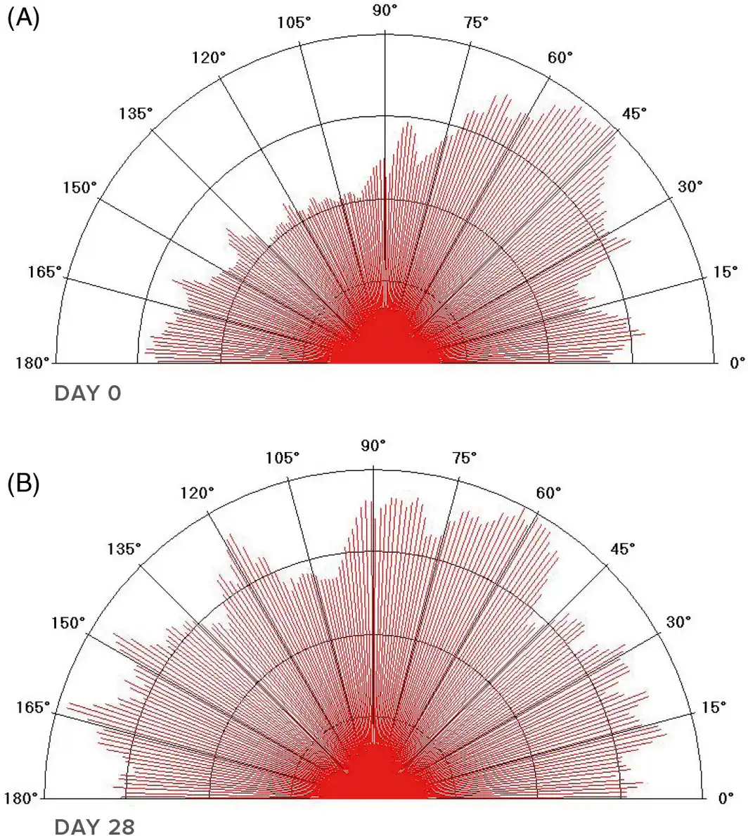 Comparison of skin isotropy in one subject via orientation of lines in cutaneous relief. Treatment with the study serum produced beneficial changes in dermal structure, from a lower degree of isotropy at day 0 (A) to a higher degree of isotropy at day 28 (B)
