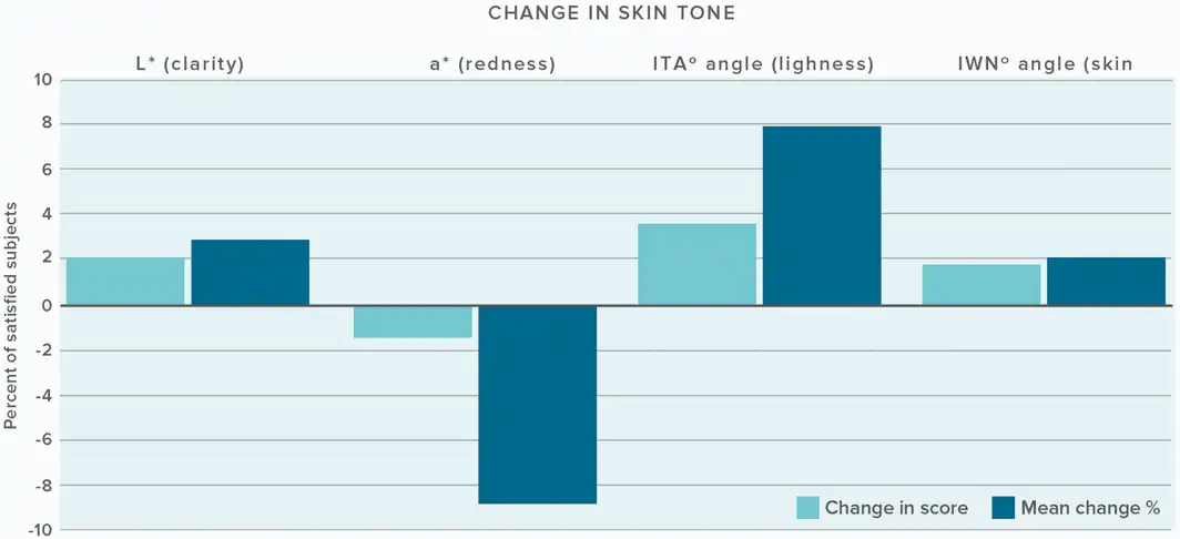 Perceived effect on skin radiance, evenness, and wrinkles, along with cosmetic acceptability were recorded by subjects via treatment logs and self‐assessment questionnaires. Subjects were asked to record a score on three skin parameters (radiance, complexion evenness, and wrinkles) every three days at home first thing in the morning in front of a mirror using a nonstructured scale from 1 to 10. Scores on each item were averaged and plotted over time. Additionally, subjects maintained a daily log to document any adverse effects or undesirable sensations. Self‐assessment questionnaires and daily logs were submitted to evaluators at the end of the 2‐month study.