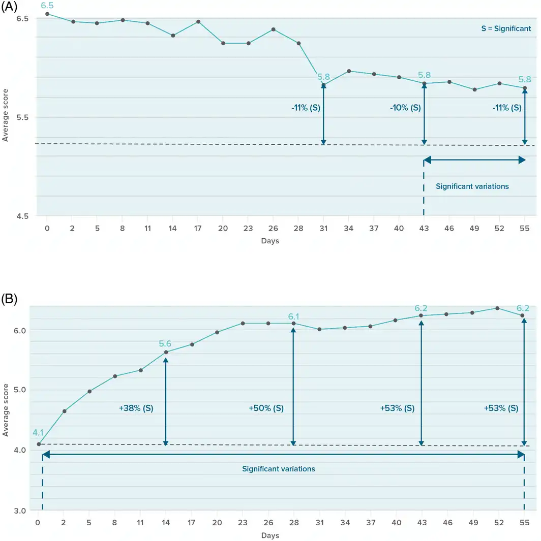 Self‐assessment scores over the trial period indicate significant and progressive perceived improvements in complexion. Novelty here resides in following consumers' perception of changes continuously over 56 days, where the average scores show significant differences to baseline after 30 and 14 days, respectively (Figure 7A,B). In addition, a more classical questionnaire confirmed the perceptions, by comparing the overall efficacy between baseline and day 56: subjects noted complexion to be more even (92%), redensified (86%), more radiant (88%), supple (88%), firmer (83%), and smoother (80%) after 56 days of use. Subjects also appreciated the organoleptic characteristics of the serum in terms of its color, texture, consistency, and finish on the skin (Table 2). The product was well tolerated, and no adverse effects attributed to the serum were observed.