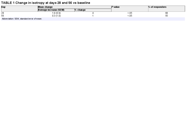 Dermal structure was assessed by analyzing the direction of lines in cutaneous relief to determine an increase in isotropy (lines oriented in several directions) vs anisotropy (a more homogenous orientation of lines) that would indicate an improvement in skin structure (Figure 2). Analysis of isotropy parameters in the periorbital region of study subjects revealed a significant mean 4% increase in isotropy in 68% of subjects on day 28 (P < .05; Figures 3 and 4, Table 1).
