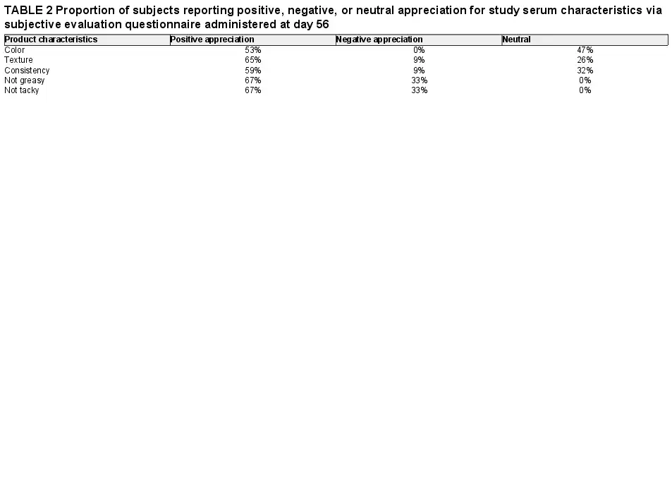 Subjects were assessed for changes in periorbital rhytides and skin structure after once‐daily application of the study serum for 56 days. Perceived effect on radiance, evenness, and wrinkles, along with cosmetic acceptability of the product was evaluated via regular self‐assessment scoring.