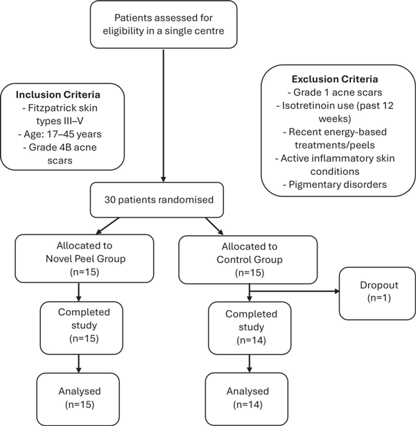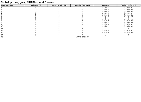 Control group (n = 14): Received no peel. One patient dropped out, resulting in a final sample size of 14 patients in the control group.