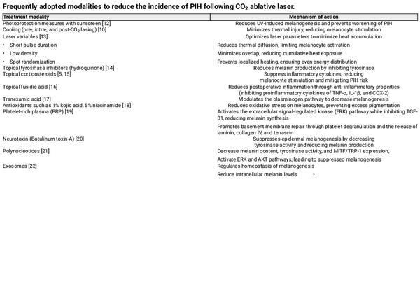 Once established, PIH can persist for several years, significantly impacting patient satisfaction and requiring prolonged intervention []. A wide range of topical, systemic, and procedural treatments exist for PIH, but prevention remains the primary objective (Table 1). Strategies for PIH prevention in CO2 laser resurfacing include topical tyrosinase inhibitors, corticosteroids, short‐pulsed lasers, photoprotection, and platelet‐rich plasma (PRP) [, , , , , , , ]. The use of post‐procedure agents such as topical fusidic acid has also been explored in clinical studies []. However, an optimal solution balancing effective scar remodeling with minimal PIH risk remains an unmet clinical need.
