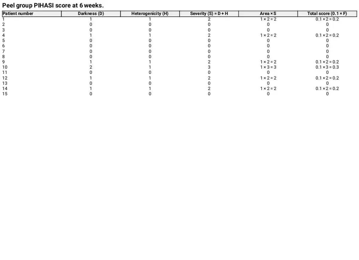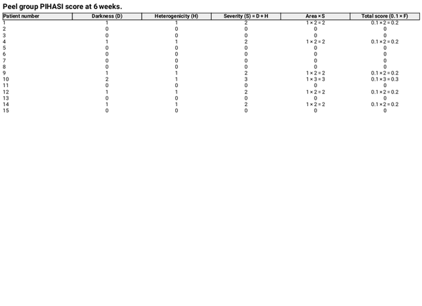 The primary outcome, PIHASI score at Week 6, was compared between the peel and no‐peel groups using the Mann–Whitney U test. Rank sums were used to assess differences between groups, and statistical significance was set at p < 0.05.