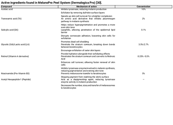 The MelanoPro Peel System is a novel formulation consisting of azelaic acid, tranexamic acid, salicylic acid, glycolic and lactic acids, retinol, niacinamide, and proprietary peptides (Table 5).