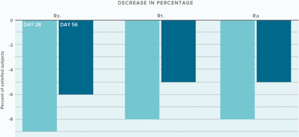 Three‐dimensional skin‐surface measurements of the periorbital region revealed significant improvements in rhytides and skin roughness over time in more than 70% of subjects (Figure 1). On day 28, average relief Rz, maximum relief amplitude Rt and skin roughness (Ra) decreased by a mean of 9% (P = .0001), 8% (P < .05), and 8% (P < .001), respectively.