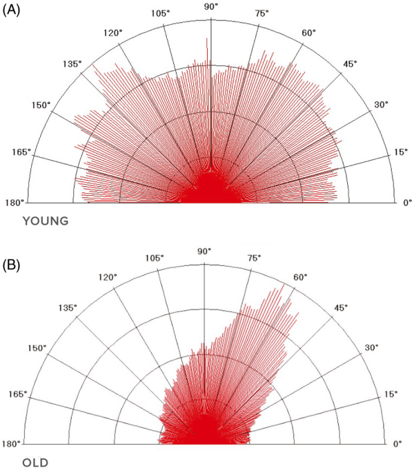 Comparison of isotropy seen in younger skin (A) vs the anisotropy of aged skin (B) based on a directional dependence in the propagation of visible and near‐infrared light through human skin in vivo. Aged skin shows strong directional anisotropy of dermal fibers, whereas the extracellular matrix in young skin is well‐structured, with less evidence of photodamage