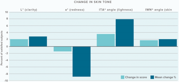 Skin tone was assessed by a facial analysis system that provides close‐up pictures under controlled conditions, allowing for before and after comparisons in quantitative terms. Photographic analysis revealed a significant increase in clarity, reduction in redness, and a more even skin tone. Although only skin‐tone improvements were quantified, photographs also demonstrated improved skin smoothness, reduced appearance of wrinkles, and a noticeable brightening effect vs baseline. These results are reflected in subject self‐assessment scores. Contrary to simple in‐use tests where consumers are asked to appreciate the alleged efficacy of the test products after the trial period, the present method of registering progressive consumer perception allows the investigator to analyze subjective impressions over the test period and to obtain useful quantitative data of increase in radiance and evenness, and decrease in the appearance of rhytides. The absence of vehicle control might be considered to constitute a limitation of the study; however, in order to evaluate the contributions of each individual active ingredient and to detect potential synergies (L‐ascorbic acid, tocopheryl acetate, and palmitoyl‐tetrapeptide 38), it would be necessary to study all seven permutations (vit C, vit E, vit C + E, peptide alone, vit C + peptide, vit E + peptide, and finally the triple combination), a rather unrealistic proposal for the purpose of demonstrating the benefits of a serum such as the present formulation.