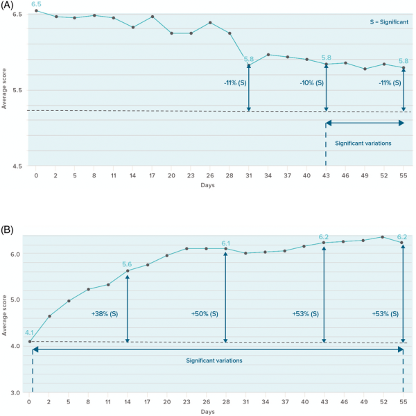 (A) Self‐assessed wrinkle score reduction from day 0 to day 56. (B) Self‐assessed changes in complexion evenness from day 0 to day 56