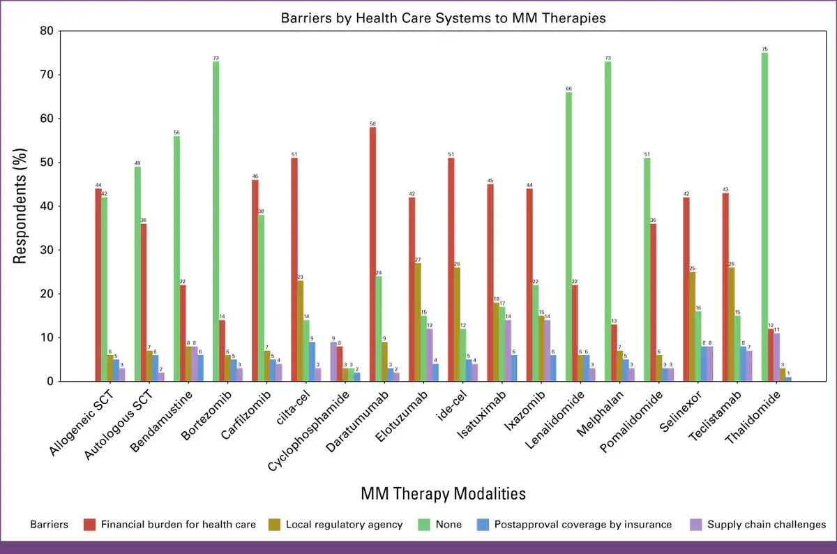 In conclusion, this survey highlights that access to innovative treatments for MM remains a global issue. The primary barriers to accessing myeloma therapies include the financial burden faced by patients and health care systems coupled with the lack of approval from regulatory agencies. This survey established partnerships with health care organizations, international agencies, governments, regulatory bodies, policymakers, and industry partners to develop effective strategies for improving access to emerging therapies.