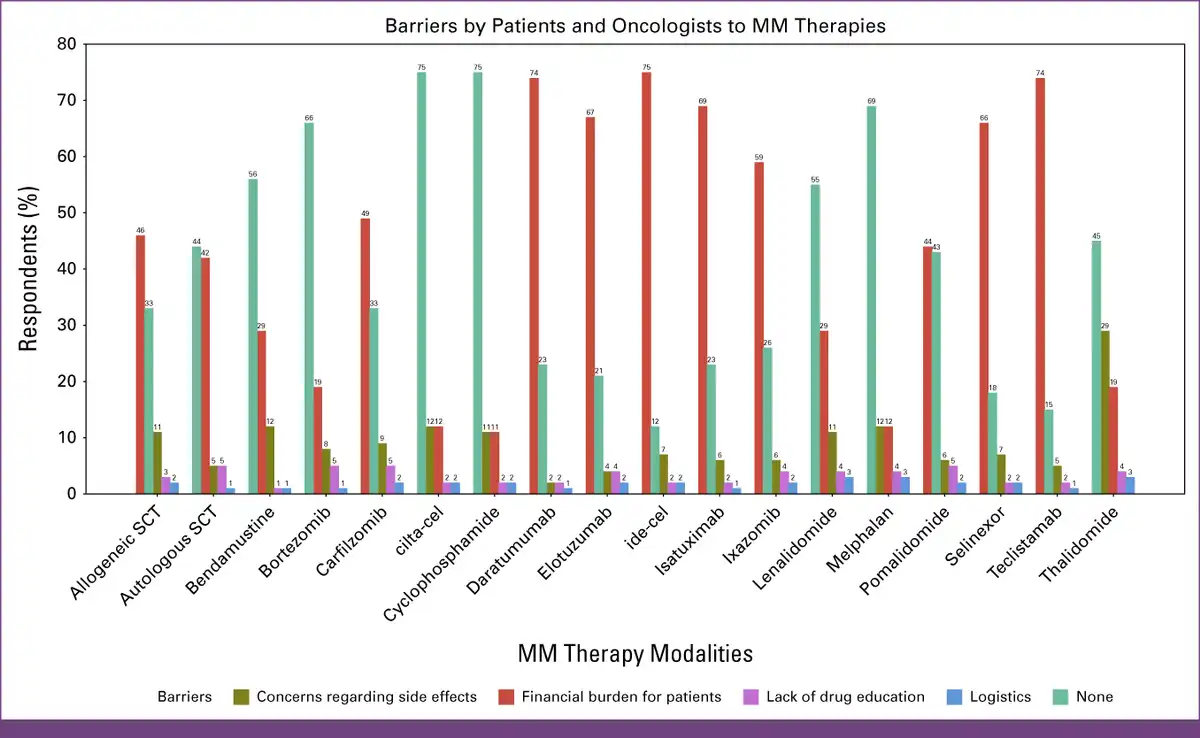 The financial burden for patients was the top-cited barrier for isatuximab (69%), elotuzumab (67%), selinexor (66%), ixazomib (59%), daratumumab (58%), and carfilzomib (49%).