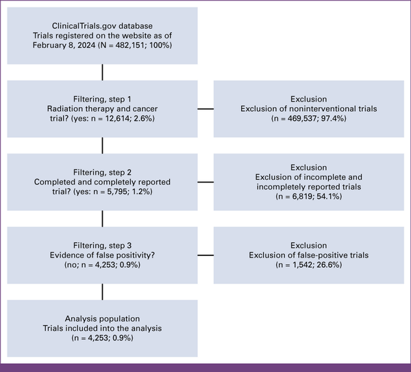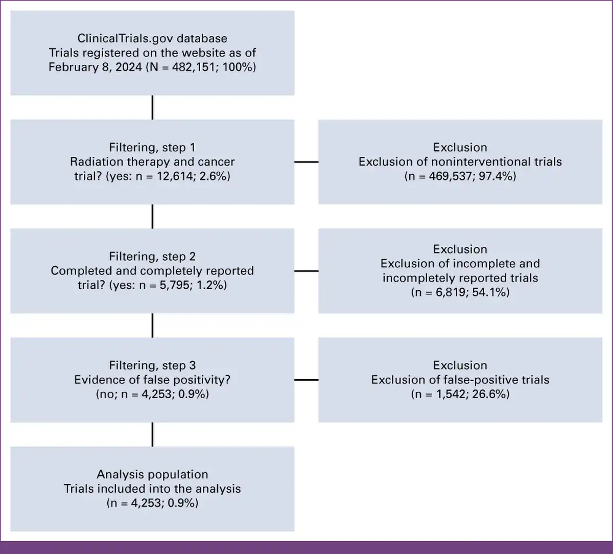 As of February 8, 2024, the ClinicalTrials.gov website compiled data from 482,151 registered studies. Filtering for cancer and radiation therapy trials conducted in the past two decades yielded an initial data set of 12,614 (2.6%) trials. After removing trials with insufficient data reporting, 5,795 (1.2%) trials remained. Subsequently, excluding false-positive trials yielded a remainder of 4,253 (0.9%) clinical trials, which were included in the analysis of this study. The flow diagram in Figure 1 shows a graphical depiction of the inclusion and exclusion criteria.