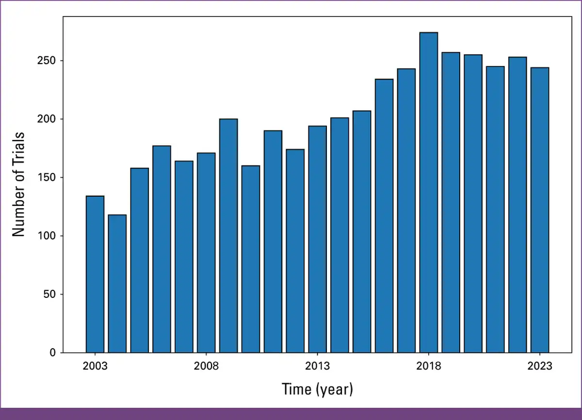Over the past two decades, 4,253 radiation oncology trials have been registered at ClinicalTrials.gov. Clinical trial activity has steadily increased: 134 trials in 2003 (n = 4,253/n = 134; 3.2%) and 118 in 2004 (n = 4,253/n = 118; 2.8%), averaging 176 annually from 2005 to 2013 (n = 4,253/n = 176; 4.1%). In 2016, 234 trials were listed (n = 4,253/n = 234; 5.5%), rising to 244 in 2023 (n = 4,253/n = 244; 5.7%). The peak was in 2018, with 274 trials (n = 4,253/n = 274; 6.4%; Fig 2).
