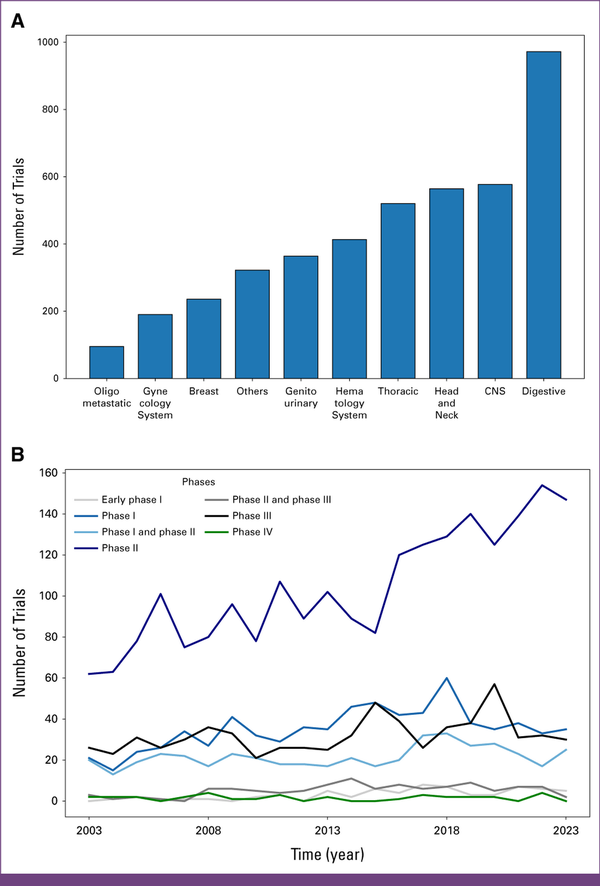 (A) Number of trials per year per tumor location. (B) Trends over time by study type.