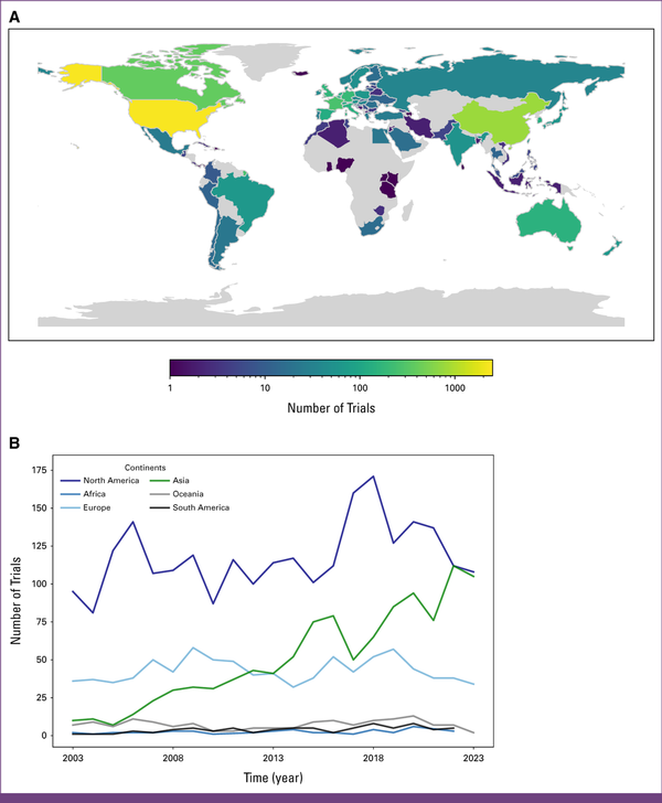North America has contributed to the majority of studies over the past two decades, yet other continents have steadily caught up in terms of research output. The remarkable surge in contributions from Asia is particularly noteworthy, signifying a significant leap in the region's involvement in clinical studies. Europe, while maintaining a stable presence, has demonstrated consistent growth in research endeavors. However, Africa remains relatively distant in terms of the number of clinical studies conducted, which in turn is also a reflection of lower patient volume, less cancer care resources, and research capacity. This evolving global distribution underscores the dynamic nature of scientific exploration and the expanding role of diverse regions in advancing medical knowledge.