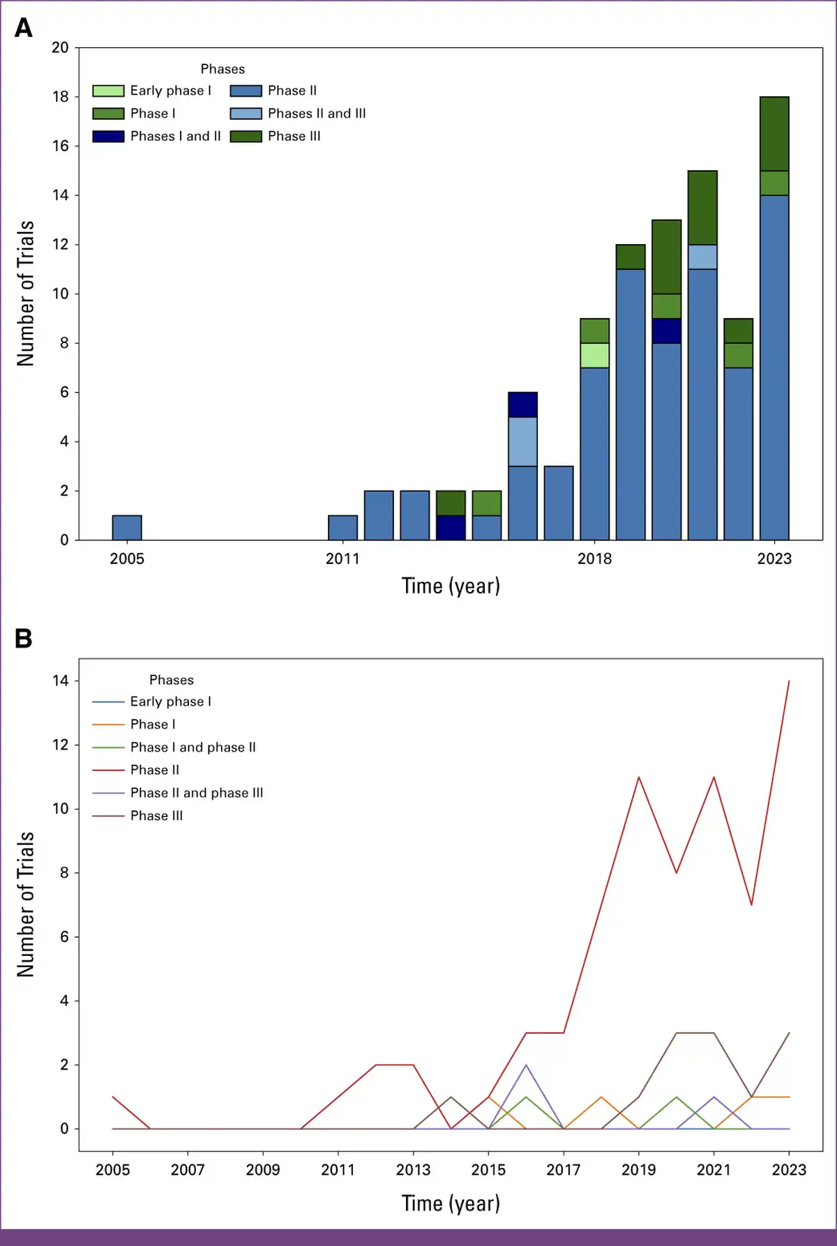 Although phase II trials are crucial for assessing treatment efficacy and generating hypotheses for further investigation, the preponderance of such studies prompts reflection on the lack of phase I trials and the translational gap between phase II and subsequent phase III trials. The abundance of phase II trials may suggest a need for improved strategies to investigate more drug-radiotherapy combinations in preclinical and phase I clinical trial settings and to facilitate the translation of promising therapies into larger, more definitive phase III trials. The prevalence of phase II trials also necessitates a critical evaluation of their role in informing clinical practice and shaping treatment guidelines, emphasizing the importance of well-designed and adequately powered trials in advancing the field.