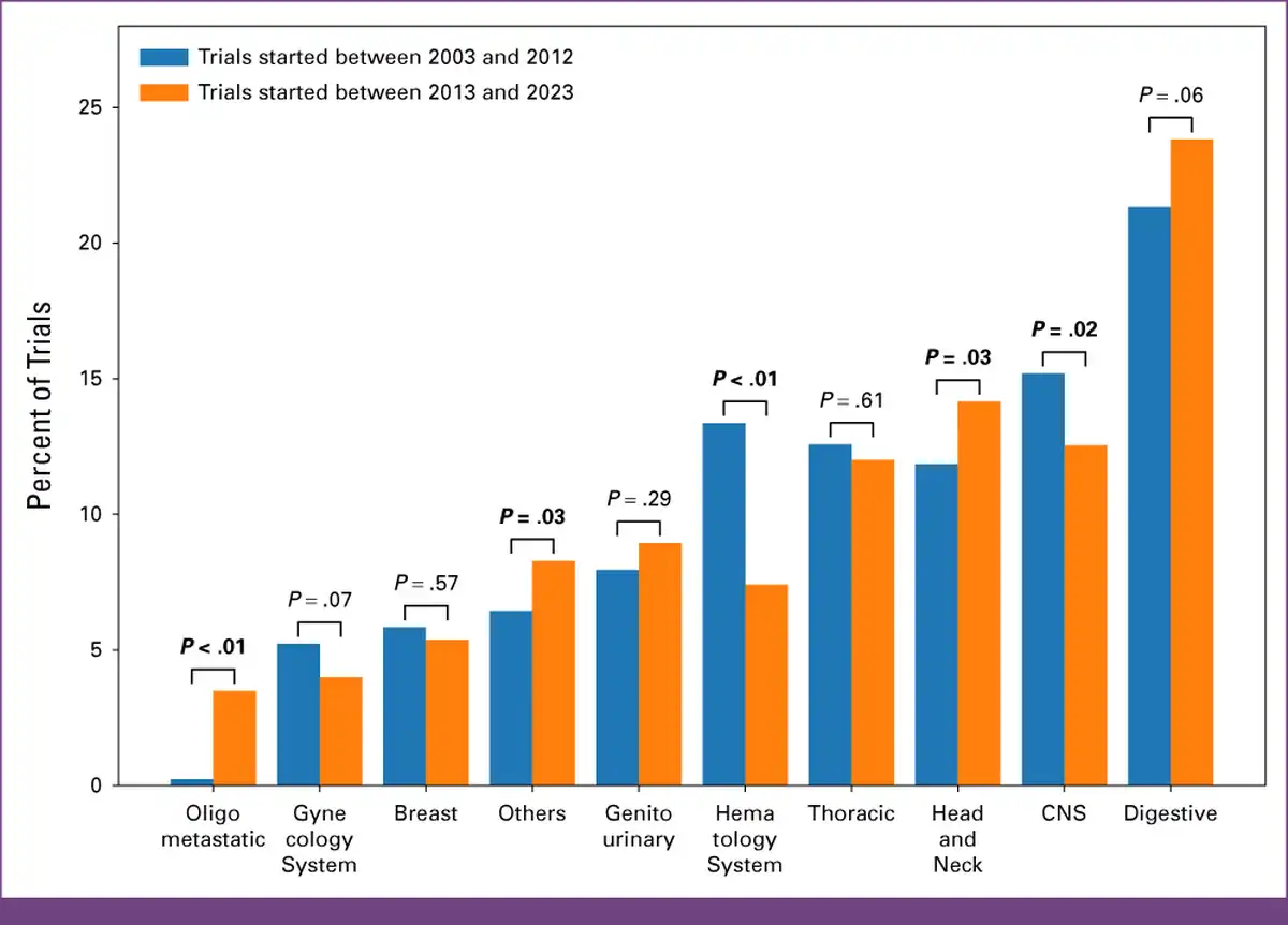 A comprehensive analysis of 4,253 radiation oncology trials from ClinicalTrials.gov demonstrates a sustained increase in trial activity, with notable growth in research on digestive, CNS, and head and neck cancers. Emerging areas, such as oligometastasis, represent new focuses, while hematology has seen declining activity. Despite these advances, only 6% of radiation oncology trials received industry funding, highlighting persistent funding challenges.