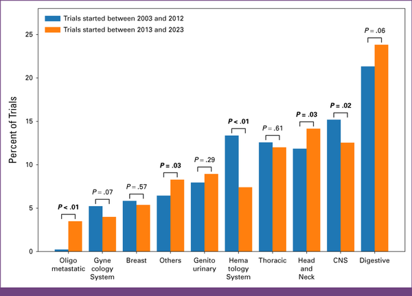 Research activity is not uniformly distributed across organ systems. The digestive system emerged in most trials, that is, 972 (n = 4,253/n = 972; 22.9%). CNS and head and neck cancers were each represented in 577 (n = 4,253/n = 577; 13.6%) and 564 (n = 4,253/n = 564; 13.3%) trials, respectively. By contrast, the gynecologic system and breast cancers had the least number of trials, with 190 (n = 4,253/n = 190; 4.5%) and 236 (n = 4,253/n = 236; 5.5%) clinical trials, respectively. OMD was the subject of investigation in 95 (n = 4,253/n = 92; 2.2%) trials, underscoring the growing importance of better understanding and addressing this specific metastatic disease state (Appendix Fig A1A). The rise in trials focusing on OMD from one decade to the next was statistically significant, with an increase from 0.2% to 3.5% (P < .01). Hematology trials experienced a decrease in trial activity, with 175 (4.1%) trials reported for the period from 2013 to 2023 compared with 238 (5.6%) in the previous decade, representing a statistically significant drop from 13% to 7% (P < .01; Appendix Fig A2; Fig 3A).