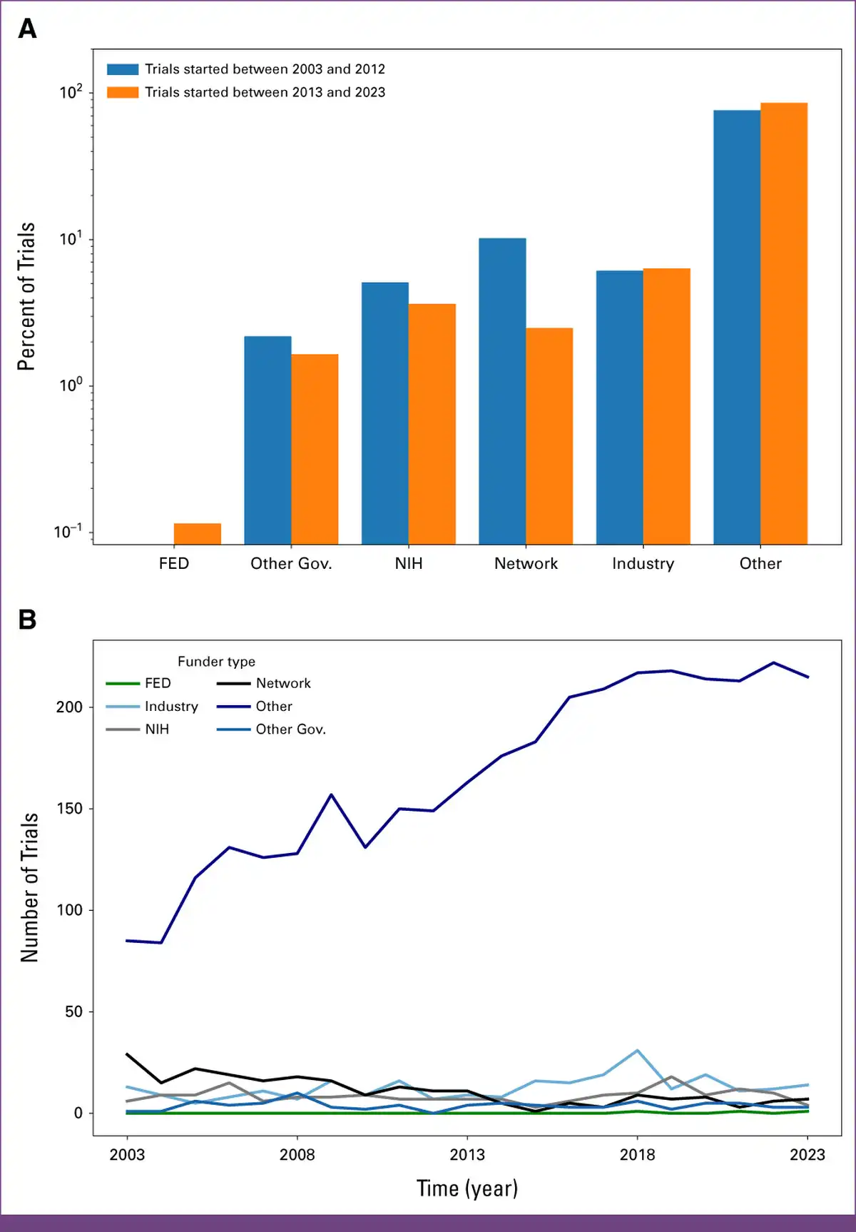Industry funding of approximately 6% over the past two decades has been notably low. Unlike medical oncology, which is heavily driven by pharmaceutical companies, radiation oncology relies on capital-intensive technologies, such as linear accelerators and proton therapy systems, which often have limited scalability and fewer repeat customers compared with drugs. Regulatory hurdles, high initial costs, and the lack of robust financial incentives for innovation further deter industry engagement. However, limited private-sector involvement arguably has the advantage of ensuring that most funding comes from publicly funded research institutions, which may reduce the potential biases associated with profit-driven motives. However, the downside is significant, as the private sector plays a crucial role in driving innovation, developing cutting-edge software programs, and advancing hardware technology. Increased industry funding can accelerate technological advancements and foster the development of novel treatment modalities in radiation oncology, ultimately improving patient care.