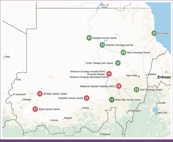 Before the conflict, Sudan had a relatively well-developed oncology infrastructure compared with other sub-Saharan African countries. KOH was the primary cancer treatment hub, providing comprehensive services, including diagnostics, treatment, early detection programs, and research. The NCI in Wad Medani was the second-largest cancer care center, serving both pediatric and adult patients. Sudan had 15 oncology centers across the country, with five providing radiotherapy services. These centers were located in Khartoum, Wad Medani, Merowe, and Shendi. Of these, only three governmental facilities provided comprehensive cancer care in Sudan, and they were located in the center of the country. Others either lacked at least one major diagnostic/treatment discipline (pathology, radiology, radiotherapy) or provided only chemotherapy-based anticancer treatment.