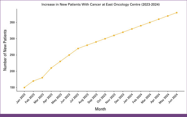 Increase in new patients with cancer at the East Oncology Centre from January 2023 to June 2024. The y-axis represents the number of new patients, while the x-axis represents the month. The gold line visually depicts the trend of increasing patients over time.