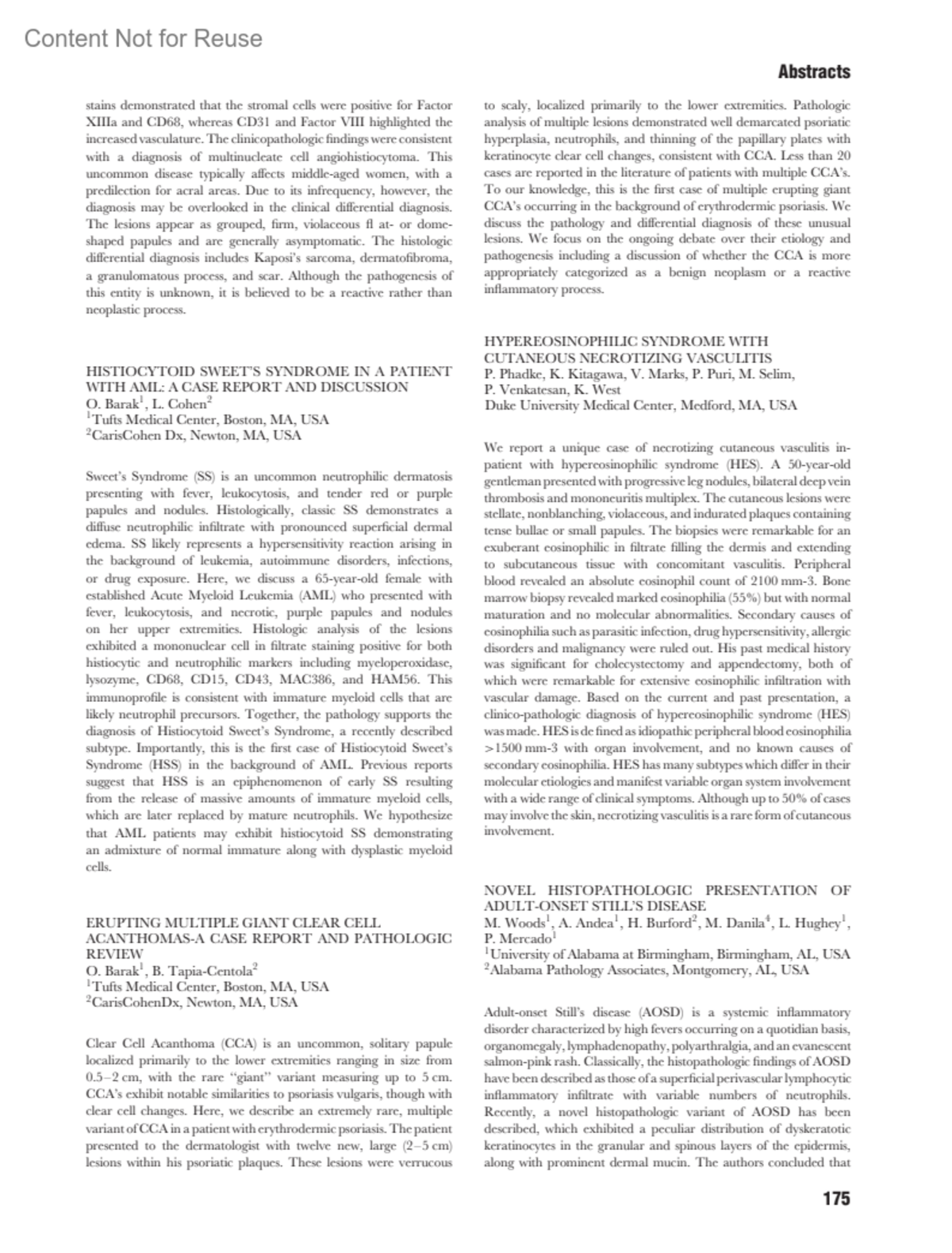 NOVEL HISTOPATHOLOGIC PRESENTATION OF ADULT-ONSET STILL'S DISEASEWoods, M.Andea, A.Burford, H.Danila, M.Hughey, L.Mercado, P.Author information1University of Alabama at Birmingham, Birmingham, AL, USA 2Alabama Pathology Associates, Montgomery, AL, USAJournal of Cutaneous Pathology 37(1):p 175-176, January 2010.Copyright © 2010 Blackwell Publishing Ltd.
