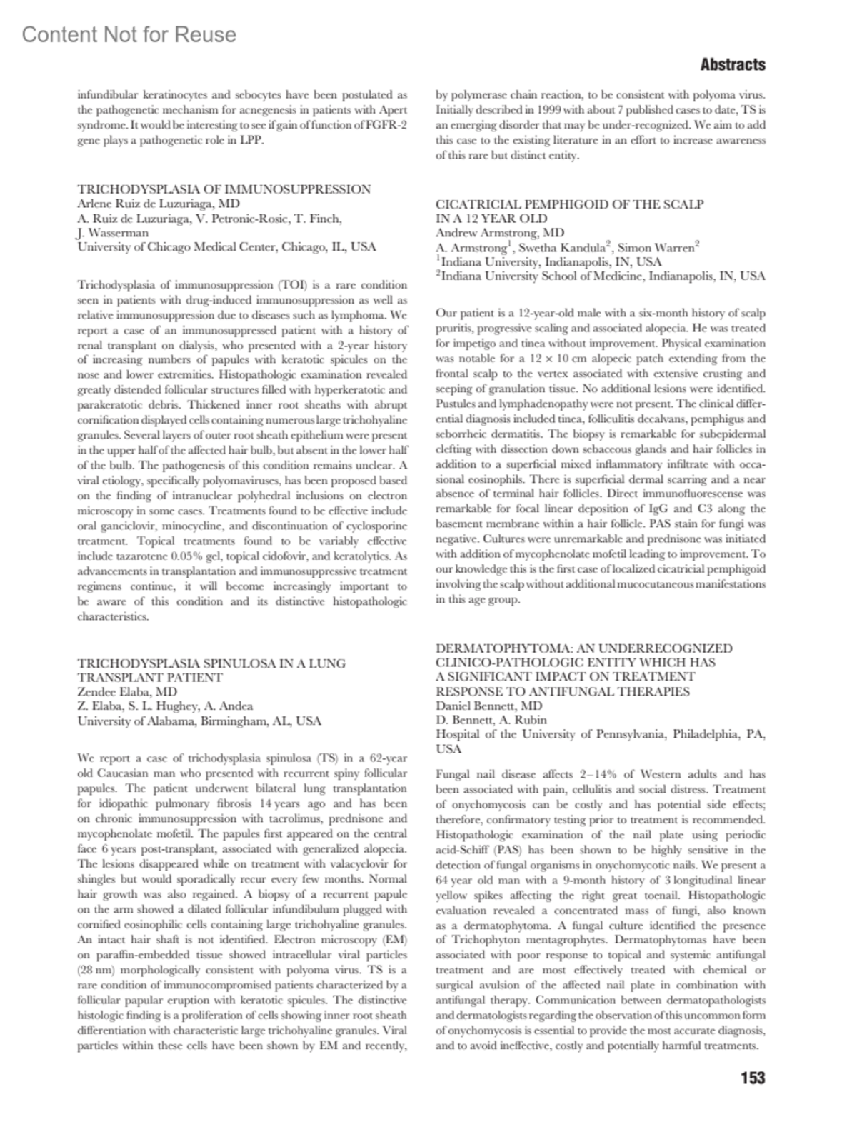 CICATRICIAL PEMPHIGOID OF THE SCALP IN A 12 YEAR OLDArmstrong, Andrew MDArmstrong, A.Kandula, SwethaWarren, SimonAuthor information1Indiana University, Indianapolis, IN, USA2Indiana University School of Medicine, Indianapolis, IN, USAJournal of Cutaneous Pathology 38(1):p 153, January 2011.Copyright © 2011 Blackwell Publishing Ltd.