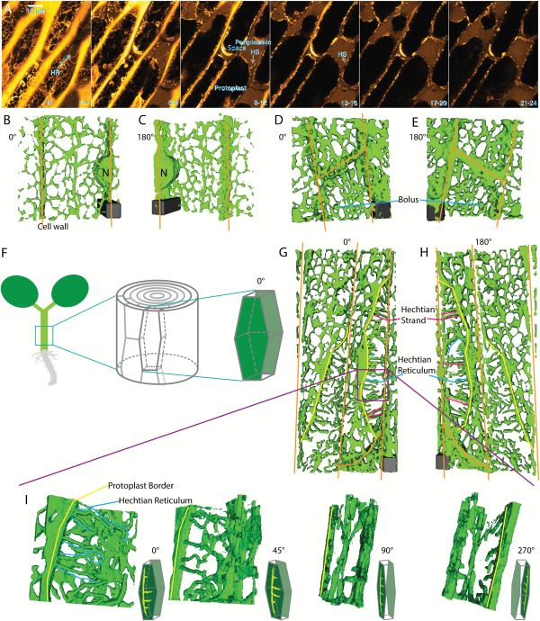 ER shape change during plasmolysis in N. benthamiana hypocotyl cells with ER lumen labeled with GFP-HDEL. A) Seedlings were treated for 45 min with 0.75 M sorbitol then incubated in sorbitol + 2.5 mg/mL Lucifer Yellow. Each image is the sum of four slices with a step size between slices of 0.53 μm. Slice range is indicated at bottom right of each frame. HS, Hechtian strands; HR, Hechtian reticulum; N, nucleus. Images are psuedocolored with the Orange Hot look-up table in ImageJ. Scale bar, 10 μm. The periplasmic space is indicated by the yellow regions outside the protoplasts that have a relatively lower intensity than that of the cell wall. B–C) 3D reconstruction of ER in control cells. Orange lines indicate cell wall. Scale bar, 6 μm*6 μm*15 μm. D–E) 3D reconstruction of ER during the recovery after plasmolysis. Scale bar, 6 μm*6 μm*6 μm. F) Illustration of the orientation of the hypocotyl epidermal cell used to generate 3D reconstruction. The face-on view toward the apical side wall of the epidermal cell is described as 0°. G–H) 3D reconstruction of ER during plasmolysis. Yellow lines indicate the border of withdrawing protoplasts. Representations of Hechtian strands and reticulum are indicated by magenta and blue lines, respectively. Scale bar, 6 μm*6 μm*5.7 μm. I) 3D reconstructions of ER in the specific periplasmic region in G–H (purple square) where Hechtian reticulum forms. Small inset of each frame indicates the angle of view toward the apical surface of the hypocotyl cell side wall.