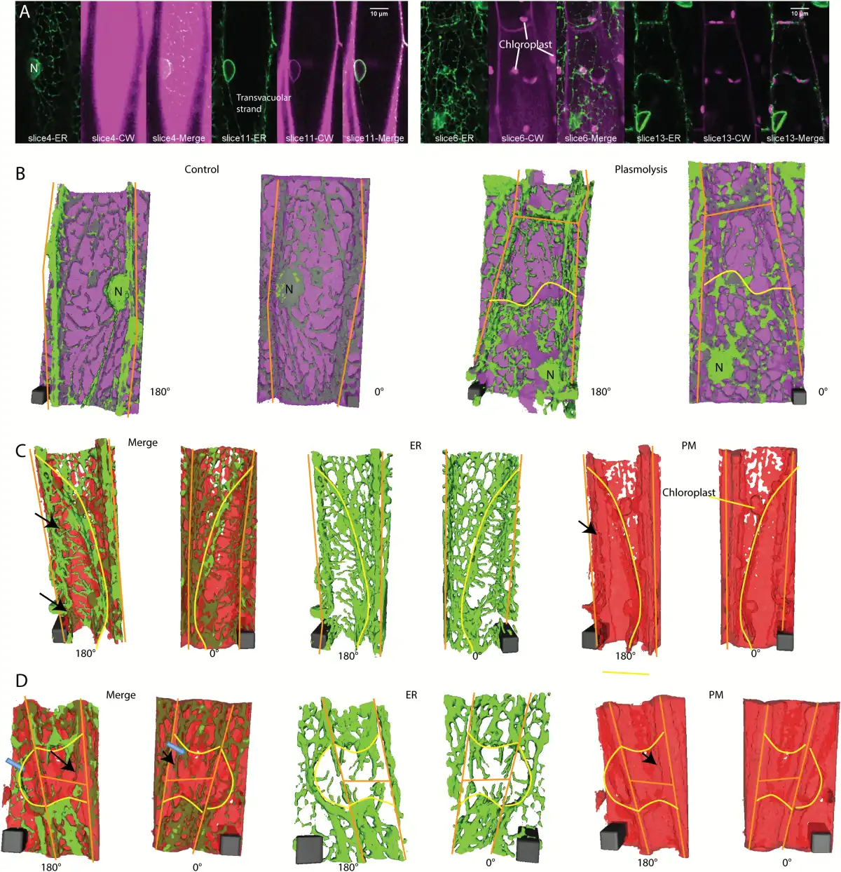 3D ER reconstructions in relation to the position of cell wall labeled with propidium iodide or plasma membrane labeled with FM4-64 in N. benthamiana hypocotyl cells expressing GFP-HDEL. A) Confocal images of ER (green) and cell wall labeled with propidium iodide (magenta) at two different focal planes in control (left panel) and plasmolyzed cells (right panel). B) 3D reconstructions of cells shown in (A). ER (green) and cell wall (magenta) in control (left 2 images) and plasmolyzed cells (right 2 images). Scale bar, 4μm*4μm*10.6μm for control, 4μm*4μm*14.31μm for plasmolysis. C) 3D reconstructions of a cell undergoing concave plasmolysis, showing the ER (green) and plasma membrane (red). Scale bar, 6μm*6μm*15.3μm. Black arrows indicate Hechtian strands surrounded by plasma membrane. D) 3D reconstructions of two cells undergoing convex plasmolysis and an adjacent cell undergoing concave plasmolysis, showing the ER (green) and plasma membrane (red). Black arrows indicate Hechtian reticulum with plasma membrane label on both the inside and outside. Adjacent cells often pull away in the same region but some show concave plasmolysis (blue arrow in 180° Merge) and others show convex plasmolysis (blue arrow in 0° Merge). Scale bar, 6μm*6μm*12μm. Yellow lines indicate withdrawing protoplast border, orange lines indicate cell wall border. CW, cell wall; PM, plasma membrane.