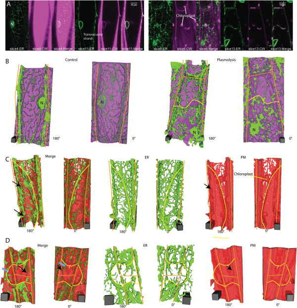The formation of the Hechtian strands and Hechtian reticulum occurs in regions of both concave plasmolysis (Fig. 2G, H) and convex plasmolysis (Fig. 3A, B). The Hechtian reticulum occurs most commonly at the outer and inner periclinal walls (see Supplementary Fig. S1 at JXB online). Convex plasmolysis, where the protoplast forms a convex structure, often forms at the cell’s apex, while concave plasmolysis often occurs along the side of the cell. In an effort to see the plasma membrane covering the Hechtian strands, cells were labeled with the plasma membrane and endosomal dye, FM 4-64, and analyzed by 3D reconstruction. Those regions with Hechtian strands (green, continuous with ER labeling) had FM 4-64 labeled plasma membrane (red) surrounding the strands in the 180° reconstruction (black arrows in Fig. 3C, D), indicating that they are coated with plasma membrane which can be more clearly seen with electron microscopy (), whereas the Hechtian reticulum appeared to be associated with the wall-plasma membrane interface that still had FM 4–64 labeling. In regions, the Hechtian reticulum may be covered by a sheet of plasma membrane partially folding back on itself (Fig. 3C). The 3D reconstructions also show the large amount of cisternalization of the protoplast ER (Fig. 3C, D).