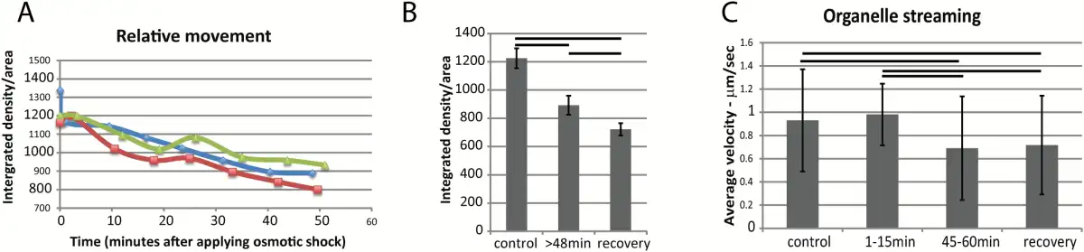 As the ER movement diminishes during plasmolysis, so the streaming of other organelles slows. Using highly refractile 1–2 µm diameter lipid bodies identified by differential interference contrast (DIC) microscopy, the rates of streaming were analyzed before, during, and after plasmolysis, Fig. 4C. A typical streaming rate of about 1 µm/s before and during the first 15 min of plasmolysis was considerably slowed with further plasmolysis (Fig. 4C). There is a possibility that this is simply the result of artificially diminishing the cell size and that streaming rates correlate with cell size (; ). However, upon 20 min of recovery during deplasmolysis, when the cell resumes its previous size, the streaming rates remain low (Fig. 4C). This corresponds to the decreased movement rates of the ER (Fig. 4B).