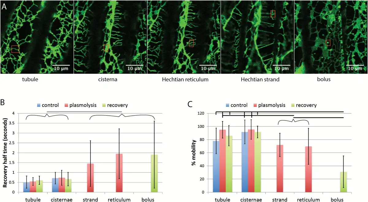 Photobleaching was done using the 405 nm diode SIM laser on the Olympus FluoView 100, set to 100% transmission and 10 microsecond dwell time. FRAP of ER-GFP was carried out during a 40-frame (41.4x41.4 μm, 200x200 pixel) video with a frame interval of 0.32 s. The bleach started after recording the first 10 frames using a bleach ROI of 4.14 x 4.14 μm (20 x 20 pixels). FRAP of microtubules during plasmolysis was carried out during a 20-frame (53 x 53 μm, 200 x 200 pixels) video with a frame interval of 0.8 s. The bleach started after recording the first 5 frames in a circular ROI (diameter 20 pixels). The videos were acquired as 16-bit gray-scale images. Each analyzed video was first processed with the Image stabilizer plugin of ImageJ (Li K. 2008. The image stabilizer plugin for ImageJ. http://www.cs.cmu.edu/~kangli/code/Image_Stabilizer.html). FRAP analysis was then carried out using FRAP profiler final plugin in Image J (Hardin J. 2016. FRAP profiler plugin in ImageJ. http://worms.zoology.wisc.edu/research/4d/4d.html#frap,lastaccessed4July2017). Recovery halftime and percent mobility was calculated from the fitted curves from each sequence. For ER luminal protein photobleaching analysis, each ER component at different stages was compared by pairs using Tukey-Kramer HSD analysis, with a confidence level of 95% (P<0.05). For microtubule photobleaching analysis, both recovery halftime and percent mobility from each microtubule component, namely polymerized microtubules in normal cytoplasm, depolymerized microtubules in protoplast, and microtubules in Hechtian reticulum, were compared by pairs using Tukey-Kramer HSD analysis, with a confidence level of 95% (P<0.05).