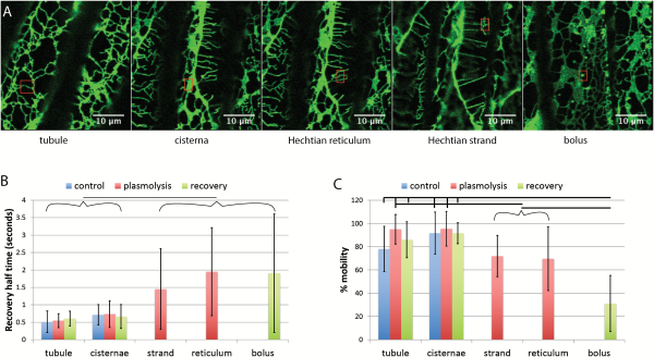 The situation for luminal flow in the Hechtian reticulum is quite different. Since it is not stretched like the ER in the Hechtian strand, there is no a priori reason to think that it is thinned. However, its half-time of recovery is even longer than that in the Hechtian strands; hence, apparent diffusion is considerably reduced. This may be a consequence of being encased in the folds of the plasma membrane, which may wrap around it. In that situation, the ER might have at least two sides of its membrane bound to the plasma membrane (Fig. 8C) and that may alter the flow within the lumen if surface flow is linked to luminal flow.