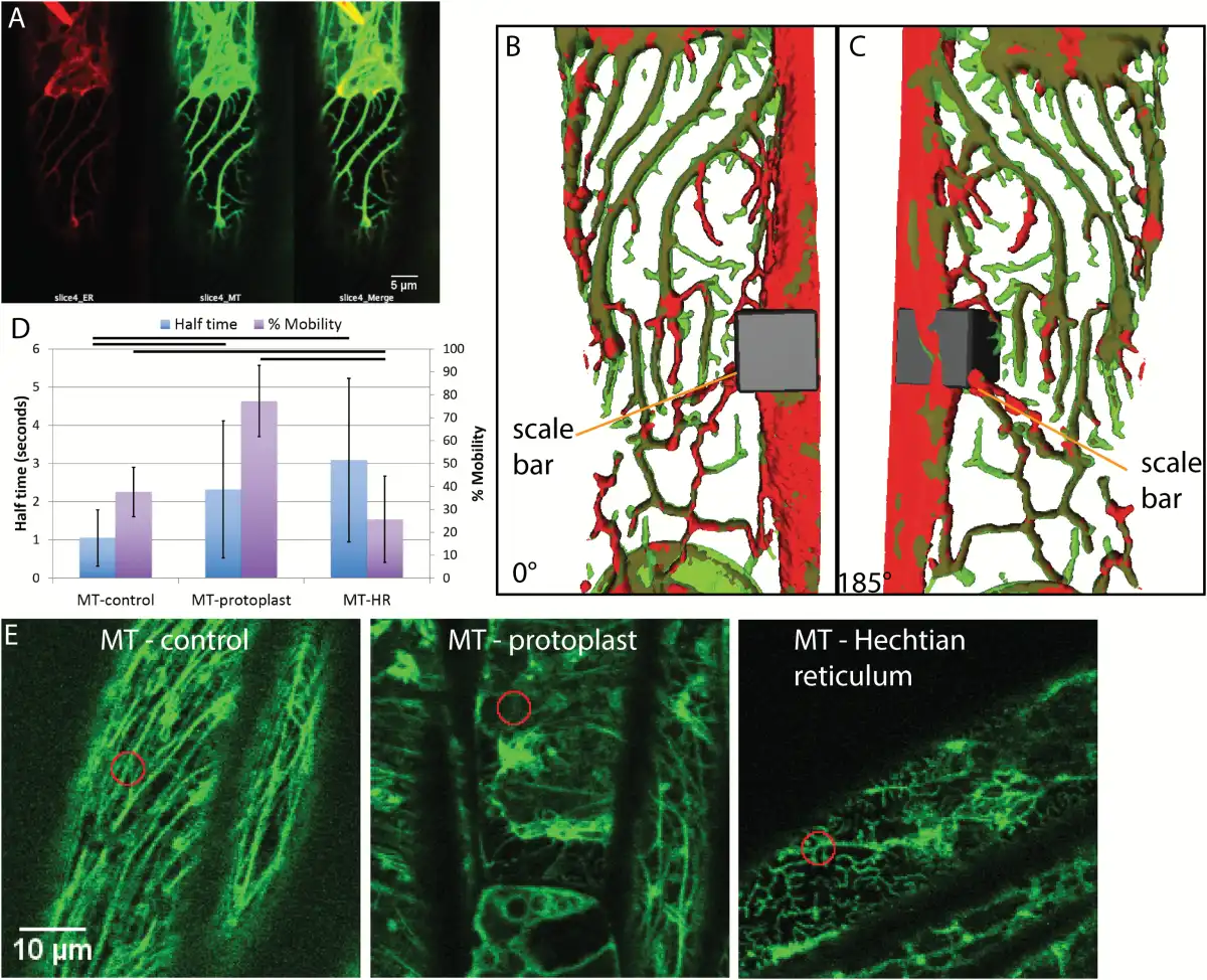 The presence of microtubules in the Hechtian reticulum and strands has been previously described (; ) but here we show that the ER tracks along microtubules in the Hechtian reticulum, as seen in plasmolyzed Arabidopsis hypocotyl cells that are dual-labeled with mCherry-HDEL and GFP-TUA6 (Fig. 6A–C). In the region of the Hechtian reticulum, which is formed predominately on the outer and inner periclinal walls (Supplementary Fig. S1), not only do the ER and the microtubules colocalize but the microtubules take on a branching morphology. This branching morphology differs from the normal morphology of microtubules (Fig. 6E), so an analysis of the behavior of their movements was undertaken (Fig. 6D). Although there is low percentage mobility in the control (Fig. 6D), that which is mobile shows rapid recovery, namely a half-time of 1 s, typical of the mobile unpolymerized tubulin in the background. The low mobility of the polymerized tubulin (Fig. 6D) is expected and is typical of microtubules undergoing treadmilling (). The predominance of depolymerized tubulin in the plasmolyzed protoplast shows fairly rapid and complete recovery, with a half-time of 2.3 s and a completion of 77.3% (Fig. 6D). However, FRAP dynamics of tubulin in the Hechtian reticulum differs from the other two conditions in that the tubulin has a very low percentage mobility but the part that does recover takes a longer time to do so, with a half-time of 3.1 s (Fig. 6D). This indicates that the recovery that does occur is a consequence of the movement of tubulin with a lower rate of diffusion than that found in the ‘background’ of the control.