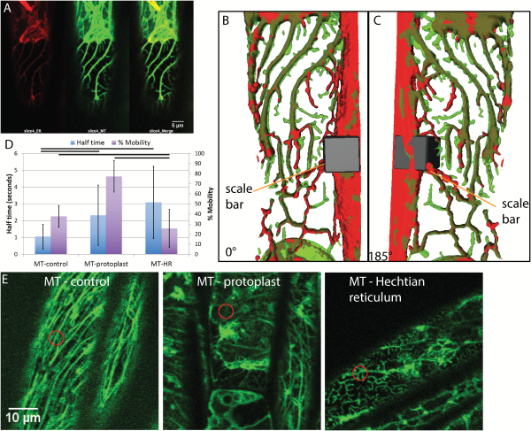 Microtubule behavior during plasmolysis in Arabidopsis hypocotyl cells with ER lumen labeled by mCherry and microtubule labeled by tubulin-GFP. A) The Hechtian reticulum of a plasmolyzed cell, showing the separate ER (red) channel, the microtubule (green) channel, and the merged image. B) 3D reconstruction of the merged volumes of the ER (red) and microtubule (green) in the Hechtian reticulum in (A) to show their colocalization. Scale bar, 7μm*7μm*10.6μm. C) 185° flip of (B). D) FRAP analysis of microtubules before plasmolysis (MT-control) and after plasmolysis in the protoplast (MT-protoplast) and in the Hechtian reticulum (MT-HR). The left-hand vertical axis shows recovery half-time; n=38, 49, and 55, respectively. The right-hand vertical axis shows the percentage mobility; n=38, 49, and 57, respectively. Horizontal bars indicate which pairwise differences are significant (P<0.05). Bars are averages. Error bars are standard deviation. E) Representative confocal optical sections of microtubules for FRAP analysis shown in (D). Orange circles indicate photobleached area. Scale bar, 10 μm.