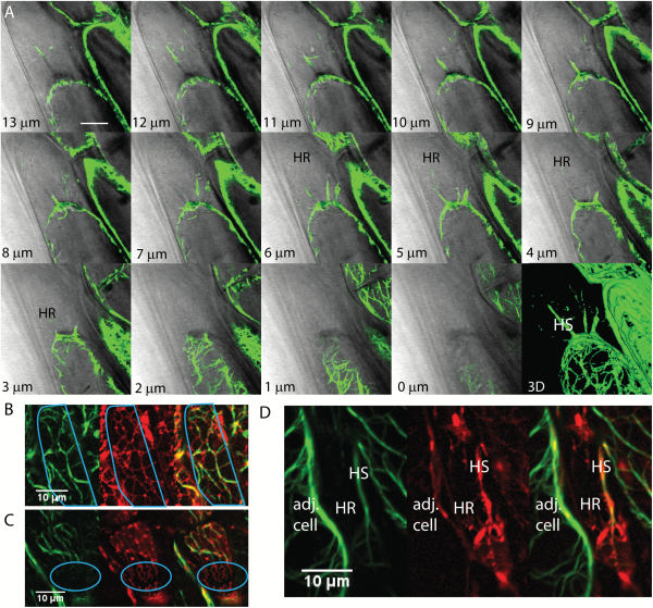 Hechtian strands and the Hechtian reticulum have both been labeled with DiOC6 (; ), a carbocyanine fluorescent dye that accumulates in response to membrane potential (). Although its selectivity for different organelles varies, it is often used to stain the mitochondria and endoplasmic reticulum (ER). Furthermore, some, but not all, Hechtian strands form at plasmodesmata, where the plasma membrane is not only attached to the wall but traverses it, and is associated with the ER desmotubule within the plasmodesmata. The ER attached to the desmotubule is presumably within these Hechtian strands. However, because DiOC6 can be a non-specific label () and not all Hechtian strands form at plasmodesmata, the question of the ubiquity of ER in the Hechtian strands and Hechtian reticulum has been unresolved. Here, we show that ER is in both the Hechtian strands and Hechtian reticulum using plants expressing ER-localized fluorescent proteins with carboxy-terminal ER retention signal (HDEL) fusions.