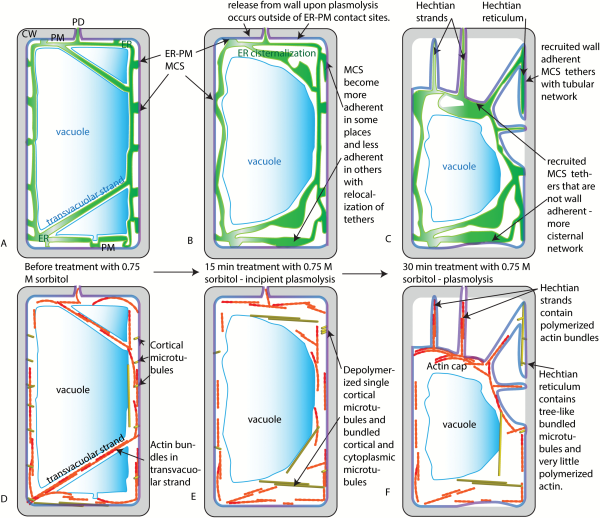 Summary and models for the change in ER and cytoskeleton during plasmolysis. A) ER, vacuole, and PM prior to plasmolysis. B) ER, vacuole, and PM after 15 min of treatment with 0.75 M sorbitol - a temporary state of incipient plasmolysis. During this time, it is proposed that an increase in cytosolic calcium is accompanied by a change in the number and distribution of MCS between the ER and the PM. It is also proposed that there is a release of the PM from the cell wall in regions enriched for MCS that are not adherent to the wall, while those ER/PM contact sites with high affinity to the wall start the process of Hechtian strand and reticulum formation. C) ER, PM, and vacuole membranes after 30–45 min in 0.75 M sorbitol. The Hechtian strands and Hechtian reticulum have formed at sites where the ER and PM and cell wall remain tethered. ER-PM contact sites on the PM of the withdrawing protoplast cause higher levels of internal cisternalization of the ER. D) Organization of microtubules and actin prior to treatment with sorbitol. E) It is proposed that an increase in cytosolic calcium ions that accompanies osmotic shock produces fewer polymerized microtubules but those that do polymerize become bundled and assume a different conformation. F) During the withdrawal of the protoplast from the cell wall after 30–45 min in 0.75 M sorbitol, actin becomes primarily associated with Hechtian strands and not the Hechtian reticulum. An actin cap forms on the withdrawing protoplast. Meanwhile, the microtubules reform as macrotubulin-containing tree-like structures in the Hechtian reticulum. ER, endoplasmic reticulum; CW, cell wall; MCS, membrane contact sites; PD, plasmodesma; PM, plasma membrane.
