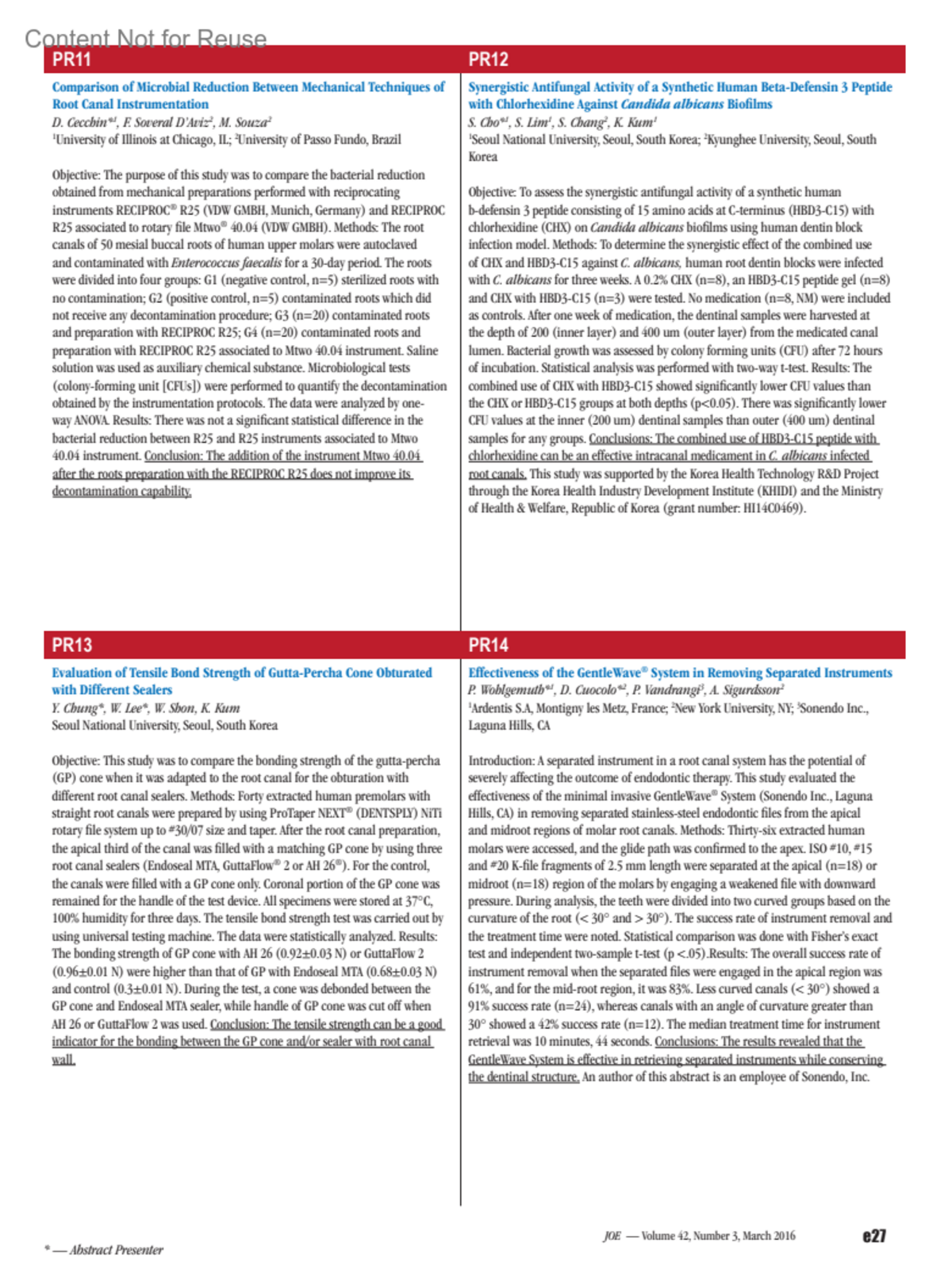 Effectiveness of the GentleWave® System in Removing Separated InstrumentsPR14Wohlgemuth, P.Cuocolo, D.Vandrangi, P.Sigurdsson, A.Author information1Ardentis S.A, Montigny les Metz, France;2New York University, NY;3Sonendo Inc., Laguna Hills, CA*— Abstract PresenterJournal of Endodontics 42(3):p e27, March 2016.Copyright ©2016The American Association of Endodontists