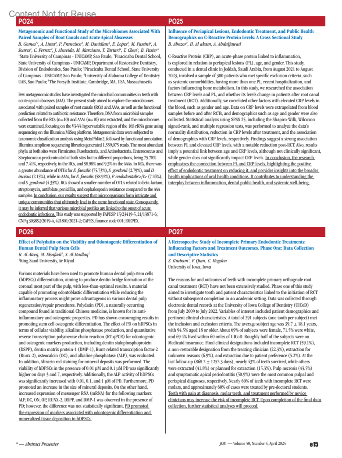 Effect of Polydatin on the Viability and Odontogenic Differentiation of Human Dental Pulp Stem CellsPO26Al-Ateeq, R.Elsafadi, M.Al-Hadlaq, S.Author information1King Saud University, Ar Riyad*— Abstract PresenterJournal of Endodontics 50(5):p e15, May 2024.Copyright ©2024The American Association of Endodontists