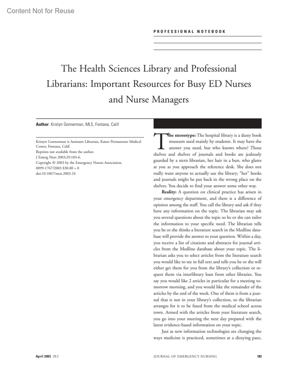 The health sciences library and professional librarians: Important resources for busy ED nurses and nurse managersGonnerman, Kristyn MLSAuthor informationFontana, CalifKristyn Gonnerman is Assistant Librarian, Kaiser Permanente Medical Center, Fontana, Calif.Reprints not available from the author.J Emerg Nurs 2003;29:183-6.Submissions to this column are welcomed and encouraged. Submissions may be sent to:Gail Pisarcik Lenehan, RN, EdD, FAANc/o Managing Editor, PO Box 489, Downers Grove, IL 60515800 900-9659, ext 4044 • [email protected]Journal of Emergency Nursing 29(2):p 183-186, April 2003.Copyright © 2003Elsevier, Inc.