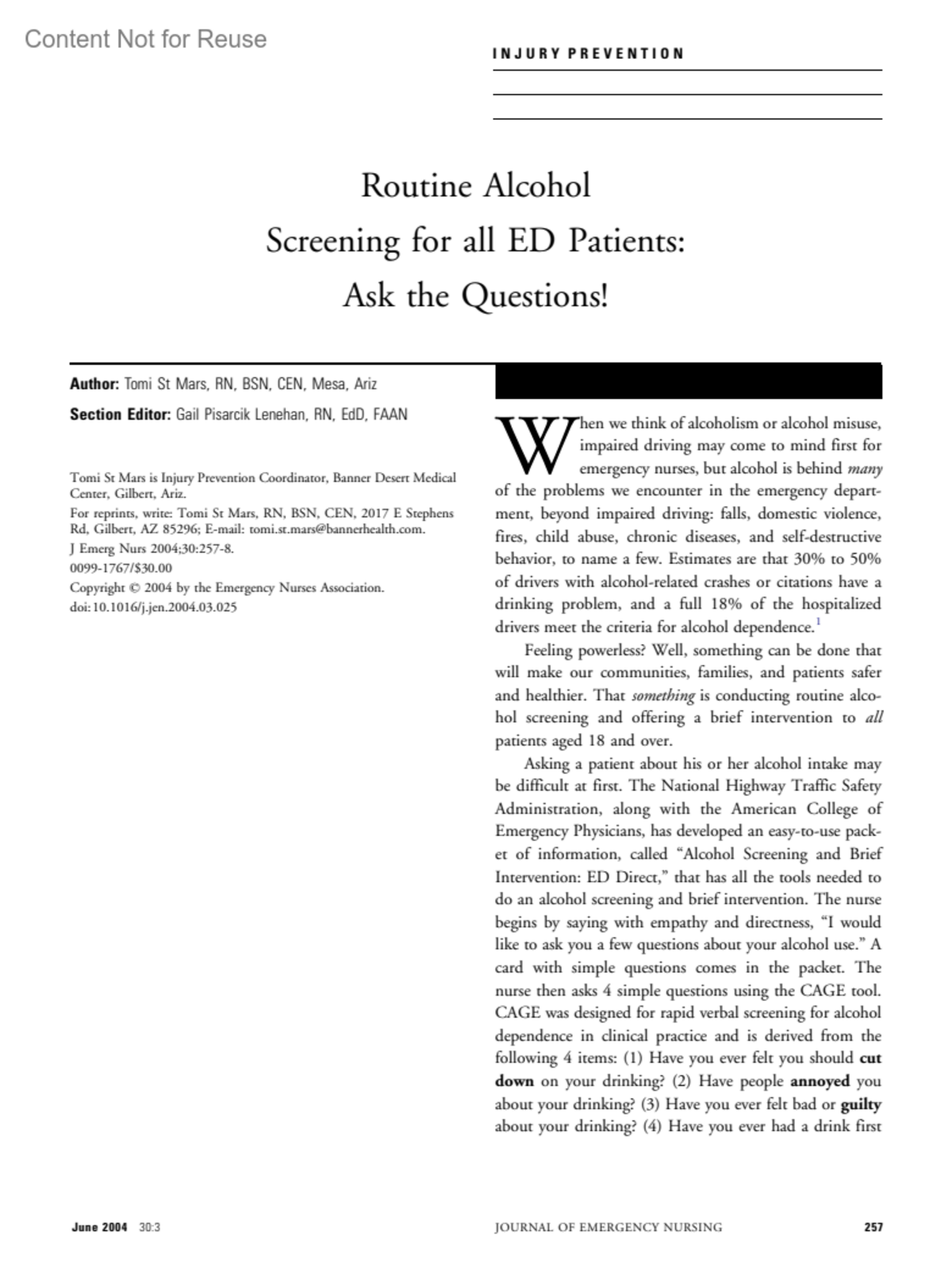 Journal of Emergency Nursing 30(3):p 257-258, June 2004.